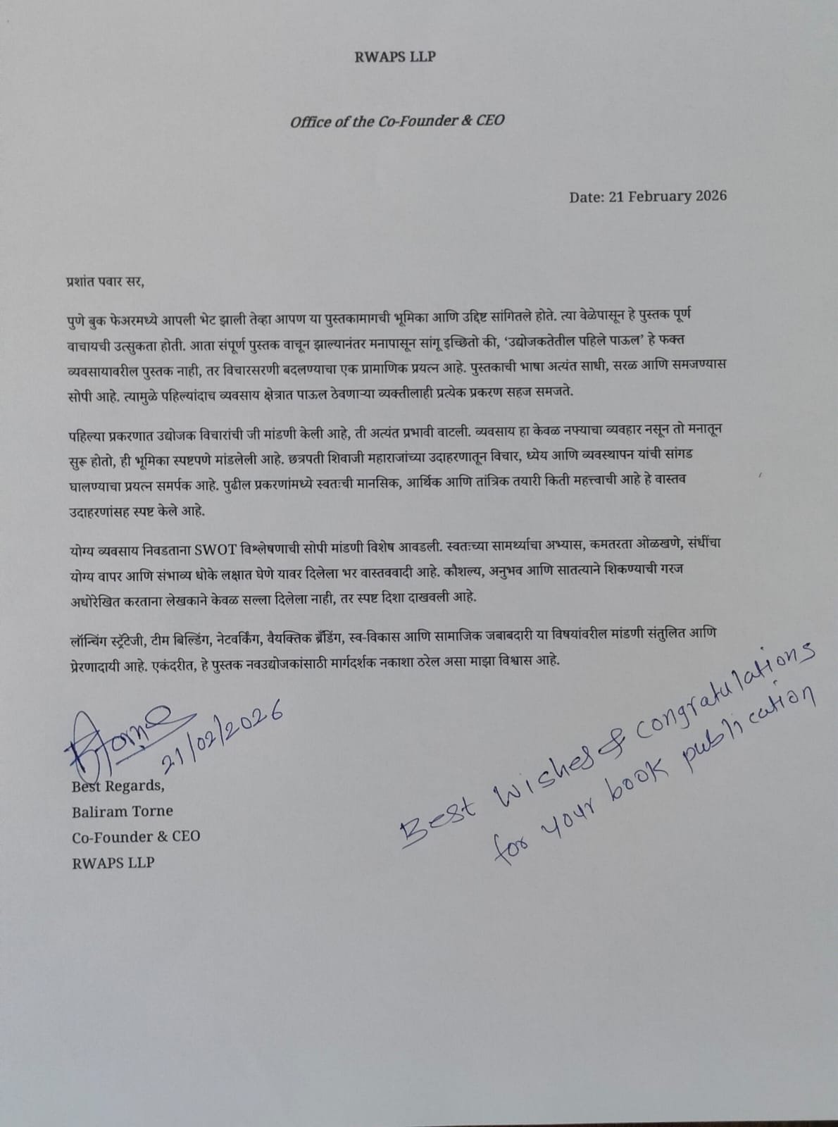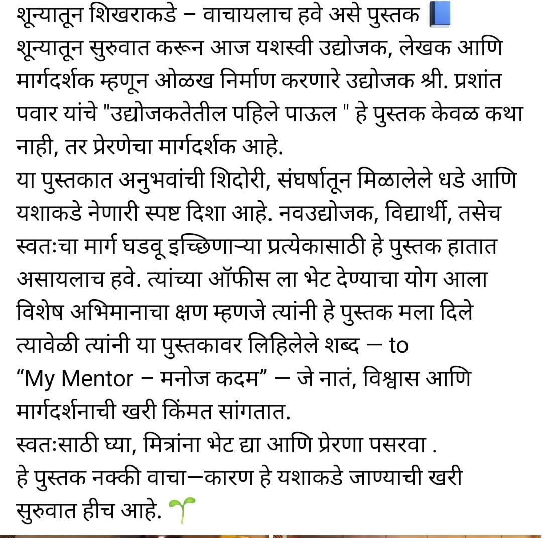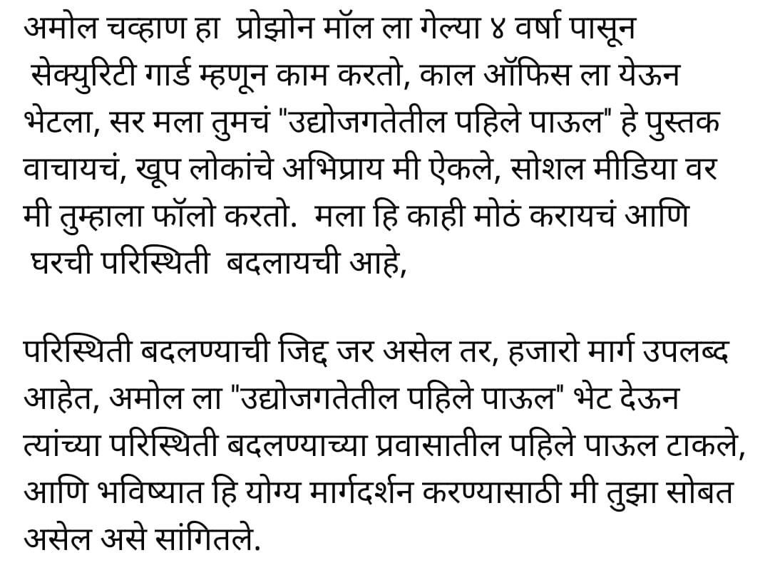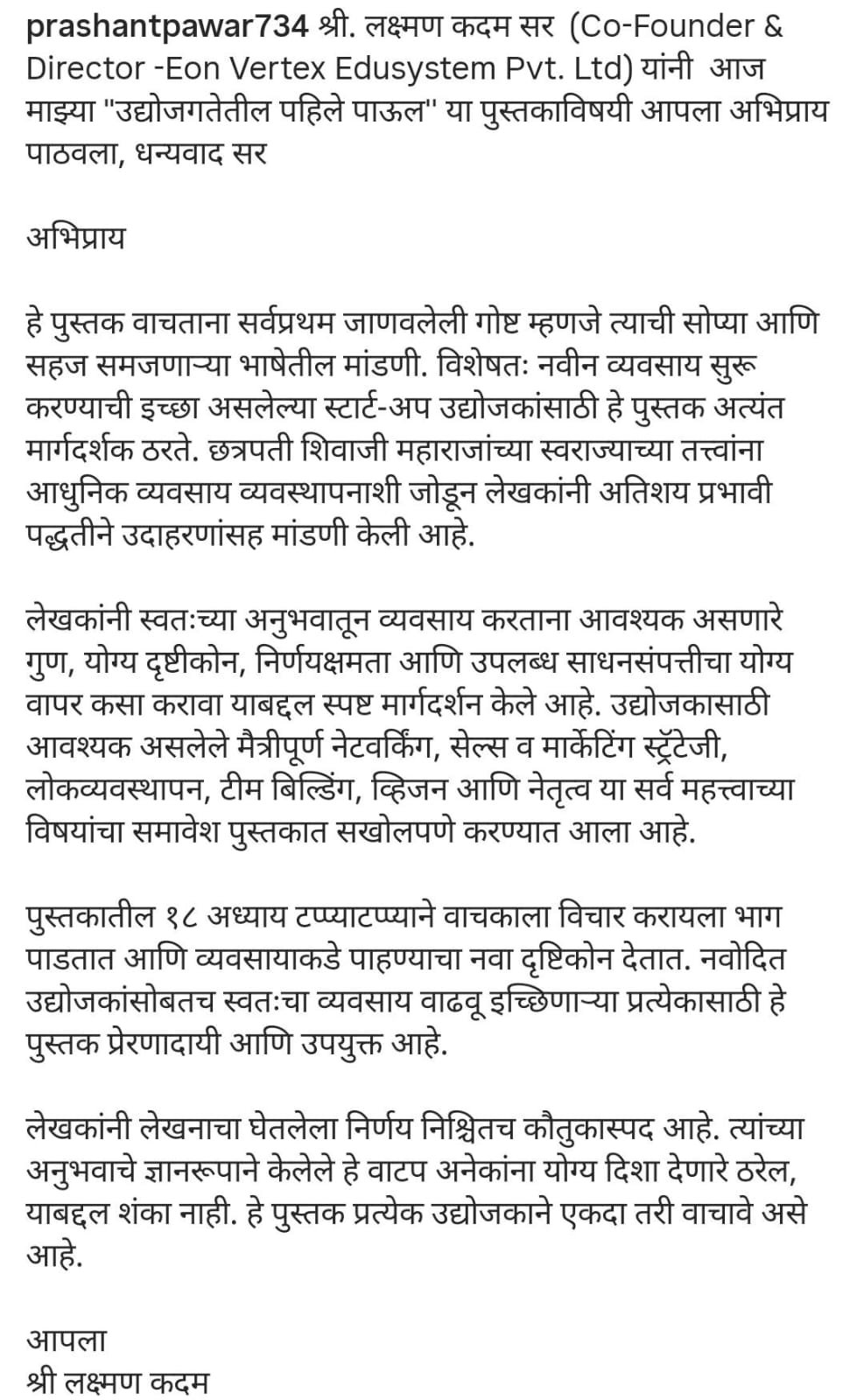 उद्योजकतेतील पहिले पाऊल (स्वप्नांचे वास्तवात रूपांतर)” हे पुस्तक उद्योजकतेचा प्रवास सुरू करू इच्छिणाऱ्या प्रत्येकासाठी एक प्रेरणादायी मार्गदर्शक आहे. वास्तविक अनुभव, संघर्ष आणि यशाच्या शिकवणींच्या माध्यमातून हे पुस्तक स्वप्न पाहणाऱ्यांना कृतीकडे नेते. व्यवसायाची सुरुवात कशी करावी, योग्य विचारसरणी कशी विकसित करावी आणि आत्मविश्वासाने पुढे कसे जायचे याचे सोपे आणि वास्तव मार्गदर्शन या पुस्तकात दिले आहे.